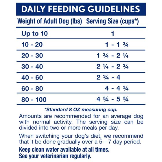 Guaranteed Analysis Crude Protein (Min.) 23.0% Crude Fat (Min.) 12.0% Crude Fiber (Max.) 4.5% Moisture (Max.) 10.0% Calcium (Min.) 0.8% Phosphorus (Min.) 0.6% Vitamin E (Min.) 80 IU/kg Taurine* (Min.) 0.25% Glucosamine (Min.) 1,200 mg/kg Omega-3 Fatty Acids* (Min.) 0.3% Omega-6 Fatty Acids* (Min.) 2.0% *Not recognized as an essential nutrient by the AAFCO Dog Food Nutrient Profiles.