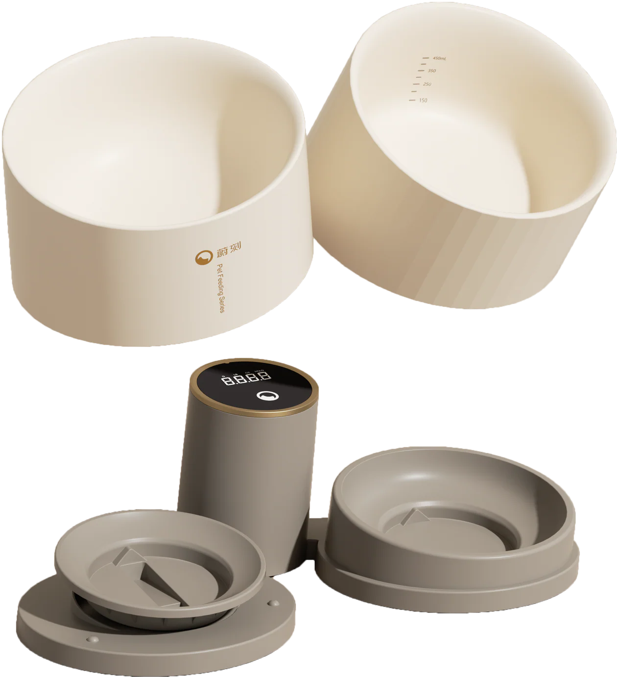 The food bowl features a rounded and shallower bottom and integrates with the scale on the stand for direct weighing. The water bowl is deeper to hold more water and lists measurements on the inside. Both bowls are designed with a 10-degree tilt to balance maximizing capacity with minimizing strain on your pets, compared to feeding and drinking with typical bowls.